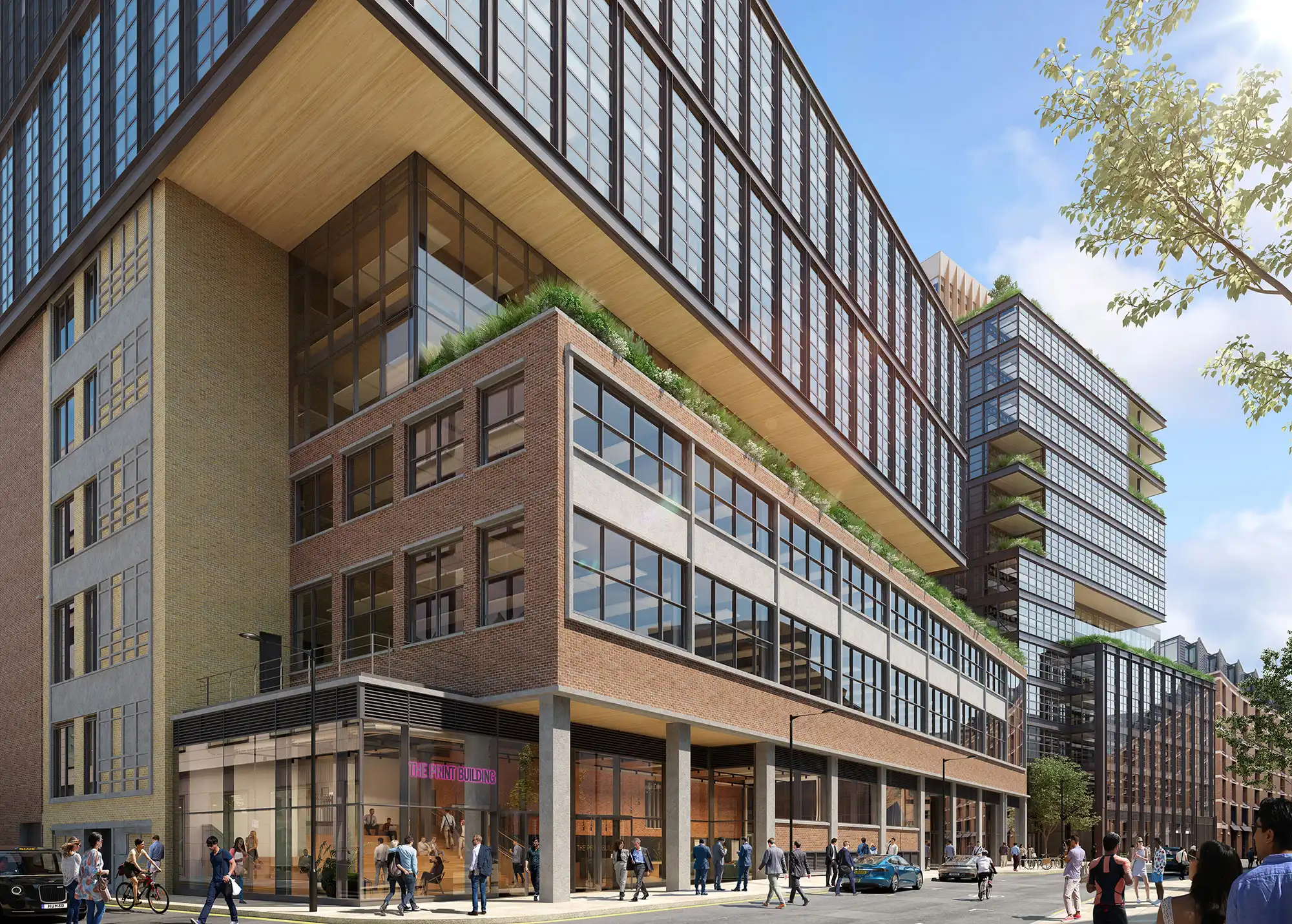 The existing site comprised of two buildings, the east building was originally built as a print works and the west building was a 1970’s office block. The scheme comprises the cut and carve of the East building retaining as much existing structure as possible and provision of a steel/CLT extension. The West building is being replaced with a hybrid steel/CLT 14-storey building.